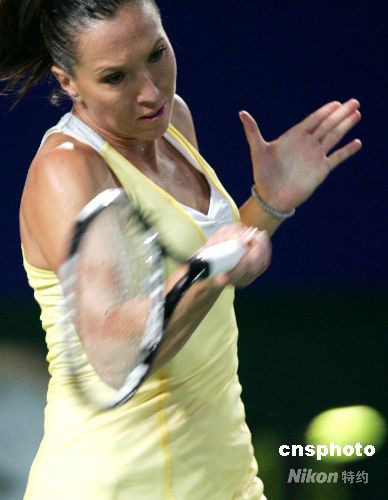 9月26日,在2008中國(guó)網(wǎng)球公開(kāi)賽女子單打四分之一決賽中,塞爾維亞選手揚(yáng)科維奇以2比0戰(zhàn)勝斯洛伐克選手漢圖楚娃,晉級(jí)四強(qiáng)。中新社發(fā) 富田 攝