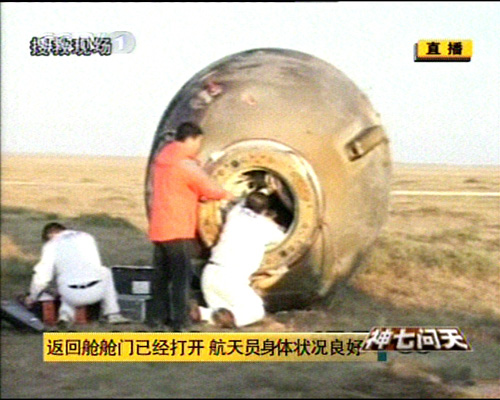 神舟七號飛船返回艙順利著陸,返回艙外觀檢查正常,搜救隊員按程序打開返回艙艙門,醫(yī)監(jiān)醫(yī)保人員檢查航天員身體狀況。經(jīng)醫(yī)監(jiān)醫(yī)保人員檢查,三名航天員身體狀況良好。三人面帶笑容。