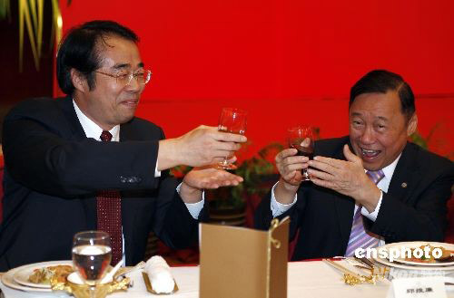 圖為國(guó)務(wù)院僑辦原主任、中國(guó)僑商投資企業(yè)協(xié)會(huì)名譽(yù)會(huì)長(zhǎng)郭東坡(右)和東南亞知名僑領(lǐng)唐裕出席招待午宴。