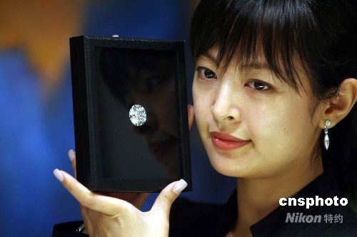 十月八日,香港佳士得向傳媒展示一批將于十二月二日拍賣的瑰麗珠寶首飾,圖中的四十四點四六克拉完美無暇巨鉆,估價超過六千萬港元。中新社發(fā) 洪少葵 攝