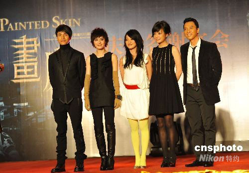 10月8日,電影《畫皮》舉行盛大慶功會,慶祝奇跡票房紀錄。9月26日引爆全國院線的東方新魔幻影片《畫皮》在上映當日票房達到1520萬元,隨后6天過億,10天狂收1.43億,在同等時間內(nèi),該成績已超過《投名狀》、《集結(jié)號》、《長江七號》等多部國產(chǎn)大片。截至10月8日,該片票房已高達1.7億。面對此驕人成績,制片方更放出豪言——《畫皮》過兩億沒有懸念。圖為《畫皮》主演陳坤、孫儷、周迅、趙薇、甄子丹在慶功會現(xiàn)場。中新社發(fā) 李學(xué)仕 攝