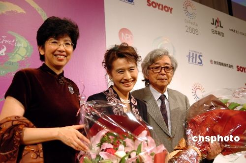 圖為在晚上舉行的開幕酒會上,中國廣電總局副局長趙實向日本著名導(dǎo)演山田洋次(右)、著名演員栗原小卷(中)頒發(fā)“中日文化交流促進(jìn)獎”,以感謝他們多年來為中日文化交流所作出的巨大貢獻(xiàn)。中新社發(fā) 朱沿華 攝