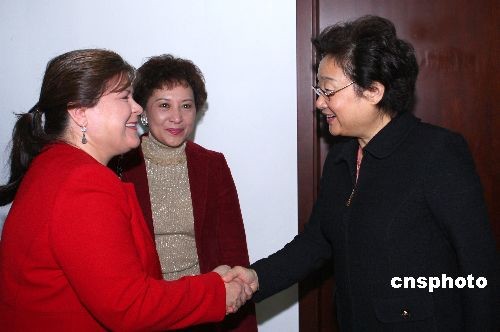 10月20日,由國務(wù)院僑務(wù)辦公室和中國海外交流協(xié)會主辦的首屆國際禮儀培訓班在北京開課。國務(wù)院僑辦主任李海峰歡迎并會見授課講師、美國前政府白宮高級禮賓官羅拉·埃福德。中新社發(fā) 廖文靜 攝