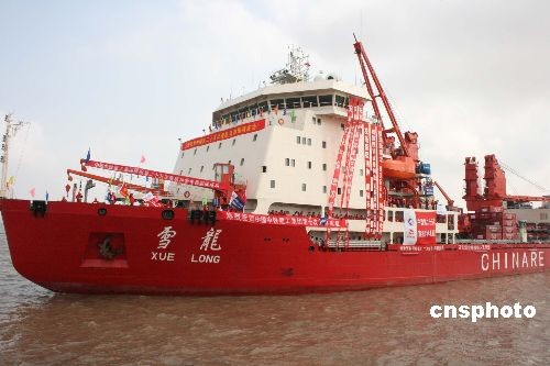 10月20日上午,中國第25次南極科考隊出征儀式在上海外高橋極地科考國內(nèi)基地碼頭舉行。極地科考船“雪龍”號收梯解纜出征。據(jù)悉,此次南極科考也是中國極地考察史上歷時最長、科考隊員人數(shù)最多的一次遠(yuǎn)征,將在南極內(nèi)陸冰蓋的最高點建立中國第一個南極內(nèi)陸考察站——中國南極昆侖站,并完成中山站建設(shè)改造以及南大洋科學(xué)考察任務(wù)!把垺贝岛匠虒⑦_(dá)24798海里,歷時173天,將于2009年4月上旬返回上海。中新社發(fā) 陸從兵 攝