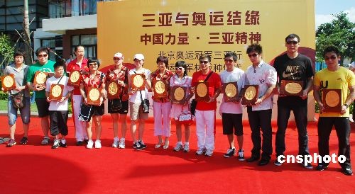 10月21日,參加“三亞城市精神評(píng)選暨奧運(yùn)冠軍三亞行活動(dòng)”的14位奧運(yùn)會(huì)冠軍在三亞灣留下“冠軍手印”。中新社發(fā) 尹海明 攝
