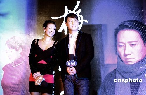 10月21日,章子怡、黎明合作演唱電影《梅蘭芳》主題曲MV北京發(fā)布會上,兩人為《梅蘭芳》電影海報揭幕。中新社發(fā) 廖攀 攝
