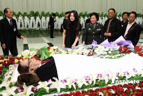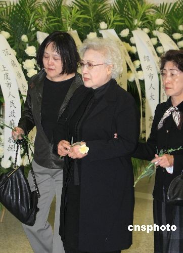 曾在謝晉導(dǎo)演拍攝的《女籃5號》里出演女主角、現(xiàn)已86歲高齡的老藝術(shù)家秦怡(中)也親自到場,為老朋友送行。中新社發(fā) 湯彥俊 攝