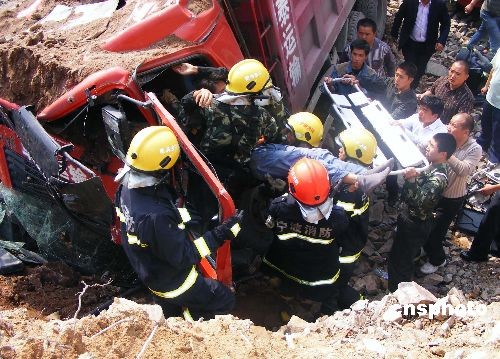 圖:大卡車制動失靈撞向山石 司機(jī)被埋(2)