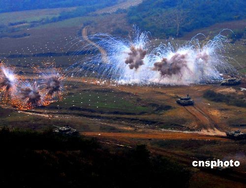 10月28日,代號(hào)為“前鋒--2008”的中國(guó)人民解放軍濟(jì)南軍區(qū)某裝甲旅進(jìn)攻戰(zhàn)斗檢驗(yàn)性實(shí)兵實(shí)彈演習(xí),在確山合同戰(zhàn)術(shù)訓(xùn)練基地展開。演習(xí)以信息化條件下的聯(lián)合作戰(zhàn)為背景,突出裝甲機(jī)械化部隊(duì)在復(fù)雜電磁環(huán)境下的山地進(jìn)攻戰(zhàn)法,鍛煉指揮員和指揮機(jī)關(guān)信息化條件下的組織能力、諸軍兵種協(xié)同作戰(zhàn)能力、部隊(duì)綜合保障能力、全面提高現(xiàn)代化部隊(duì)的戰(zhàn)斗能力。中新社發(fā) 宋吉河 攝