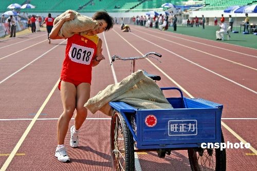 圖為女子60米搶收糧食進(jìn)倉(cāng)比賽中選手把“搶收的糧食”裝上三輪車(chē)。中新社發(fā) 傅丹丹 攝