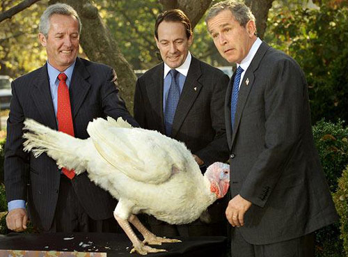 2001年感恩節(jié)期間,布什總統(tǒng)赦免一只名叫“自由”的火雞,這只火雞一下子撞向布什肚子。作者:旺仔