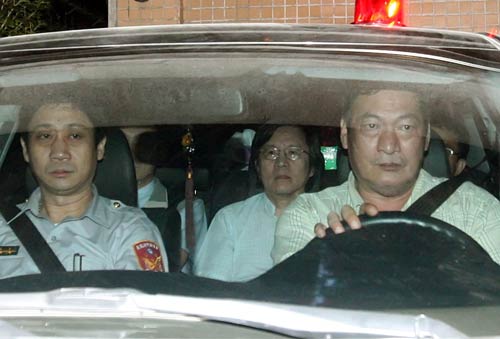 臺(tái)灣特偵組30日晚間傳喚臺(tái)當(dāng)局前“國(guó)安會(huì)秘書(shū)長(zhǎng)”邱義仁(中)及5名證人到案。檢察官偵訊后認(rèn)為邱義仁涉嫌利用職務(wù)詐取財(cái)物罪嫌,于31日凌晨將邱義仁移送法院聲請(qǐng)羈押禁見(jiàn)。臺(tái)北法院審理后裁準(zhǔn),邱義仁坐進(jìn)囚車,被送往臺(tái)北看守所。“中央社”圖