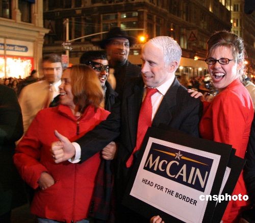 當(dāng)?shù)貢r間10月31日晚,第三十五屆“紐約格林威治村萬圣節(jié)游行”隆重登場,曼哈頓六大道人山人海,盡管面對金融風(fēng)暴,但紐約客依然“群魔亂舞”,極盡瘋狂。有人裝扮成總統(tǒng)候選人麥凱恩和副總統(tǒng)候選人佩林,但立刻有奧巴馬的粉絲向他們高喊:奧巴馬!中新社發(fā) 彭偉祥 攝