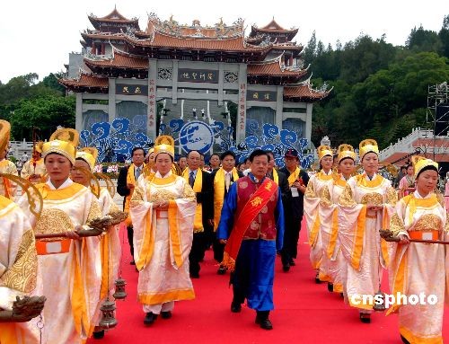 十一月一日,由海峽兩岸攜手共同舉辦的第十屆湄洲媽祖文化旅游節(jié)在“媽祖故鄉(xiāng)”福建莆田湄洲島開幕,來自十七個國家及地區(qū)的近三百家媽祖文化機(jī)構(gòu)、萬余名海內(nèi)外信眾回到“娘家”,共祭媽祖。圖為當(dāng)日在該媽祖文化旅游節(jié)上舉行的五洲信眾同祭媽祖大典。中新社發(fā) 劉可耕 攝