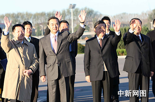 11月3日,海協(xié)會會長陳云林一行7時30分許乘機離京赴臺,國臺辦主任王毅前往機場送行。中新社記者 趙振清 攝