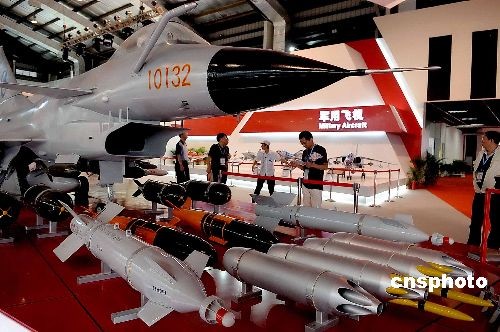 11月4日,第七屆中國(guó)國(guó)際航空航天博覽會(huì)開(kāi)幕,倍受關(guān)注的中國(guó)“殲十”殲擊機(jī)首次亮相,并做飛行表演。圖為展館展示“殲十”殲擊機(jī)所攜彈頭 。中新社發(fā) 陳文 攝