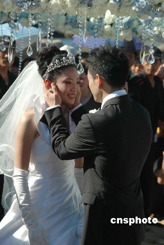 圖為雙方交換新婚戒指后,楊威在婚禮上激吻新娘楊云,演繹極度浪漫。中新社發(fā) 尹海明 攝