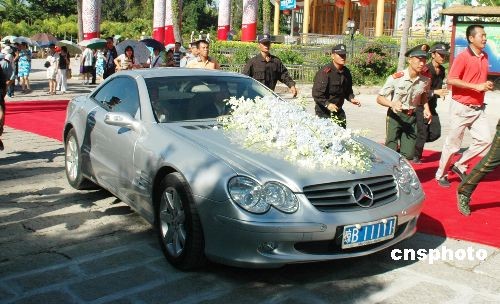 11月6日,2008北京奧運(yùn)會體操“全能王”在海南三亞著名的天涯海角景區(qū)的沙灘上舉行盛大浪漫的婚禮,與新娘楊云經(jīng)過8年的愛情長跑,終于走進(jìn)婚姻的殿堂。圖為楊威迎娶楊云的豪華婚車。中新社發(fā) 尹海明 攝