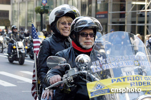 11月11日,紐約在曼哈頓第五大道上舉行一年一度的退伍軍人節(jié)大游行,今年已是第90屆。圖為美國退伍大兵威風(fēng)凜凜地騎行在游行隊(duì)伍最前面的摩托車方陣中。中新社發(fā) 魏晞 攝