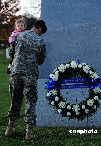 圖為11月11日,美國傳統(tǒng)的“老兵節(jié)”,一名傷殘的美國海軍陸戰(zhàn)隊士兵來到位于華盛頓特區(qū)一河之隔的弗吉尼亞阿靈頓國家公墓,抱著孩子給自己在伊拉克犧牲的戰(zhàn)友敬獻花圈。中新社發(fā) 邱江波 攝