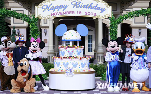 11月18日,東京迪斯尼樂園為恰逢80壽誕的動畫明星米老鼠米奇舉行生日會。米奇的女朋友米妮、唐老鴨等迪斯尼明星和10名來自日本各地的與米奇同一天生日的嘉賓參加了生日會,他們?yōu)槊灼鎺砹藲g樂的生日歌及一個高約2米的巨大蛋糕。