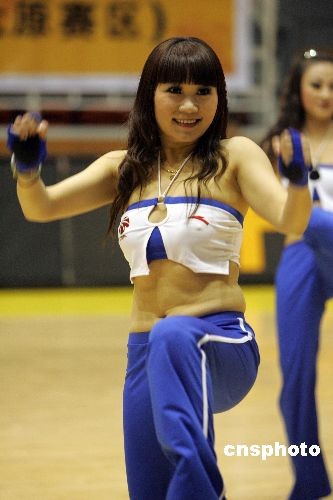 11月19日晚,CBA08-09賽季第二輪比賽打響,山西中宇坐陣山西財(cái)經(jīng)大學(xué)體育館主場迎戰(zhàn)八一隊(duì)。圖為現(xiàn)場正在勁歌熱舞的靚麗籃球?qū)氊悺V行律绨l(fā) 張?jiān)?攝