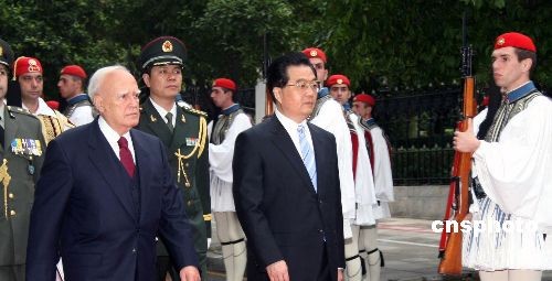 希臘總統(tǒng)帕普利亞斯二十四日下午在總統(tǒng)府舉行儀式,歡迎中國(guó)國(guó)家主席胡錦濤訪問(wèn)希臘。圖為胡錦濤在帕普利亞斯陪同下檢閱希臘國(guó)家儀仗隊(duì)。中新社發(fā) 吳衛(wèi)中 攝