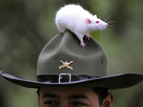 最小的“警察”——9月9日,波哥大,一只搜查爆炸物的小白鼠站在警察的帽子上。