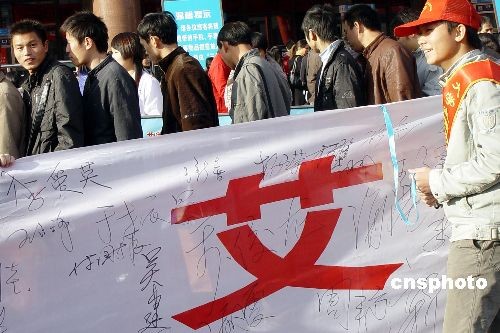 鄭州火車站過往旅客走過防“艾”簽名條幅。中新社發(fā) 李志全 攝