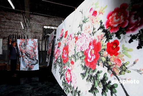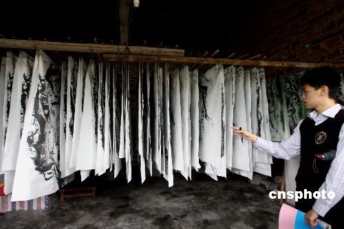 圖為今冬農(nóng)民畫師晾曬的國畫。中新社發(fā) 王麗南 攝