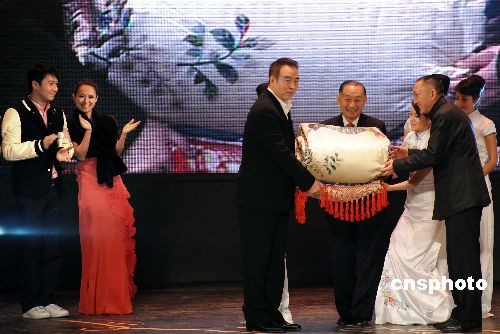 12月2日晚,陳凱歌執(zhí)導(dǎo)的電影《梅蘭芳》在北京中影懷柔影視基地舉行首映禮,片方陳凱歌、韓三平向梅蘭芳之子歸還其父使用過的“守舊”。梅葆玖曾將“守舊”借給《梅蘭芳》攝制組用于電影拍攝。中新社發(fā) 廖攀 攝