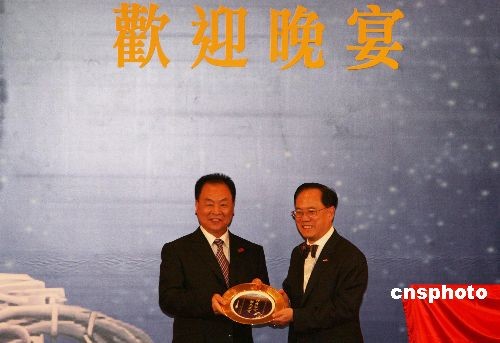 圖為香港特別行政區(qū)行政長官曾蔭權(quán)向代表團(tuán)團(tuán)長張建啟贈(zèng)送禮物。中新社發(fā) 武仲林 攝