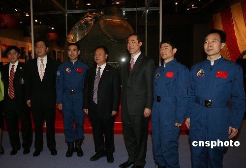 圖為香港政務(wù)司司長(zhǎng)唐英年、神舟七號(hào)載人航天飛行赴港代表團(tuán)團(tuán)長(zhǎng)暨中國(guó)載人航天工程副總指揮張建啟、神七航天員翟志剛、劉伯明、景海鵬等在返回艙前合影。中新社發(fā) 武仲林 攝