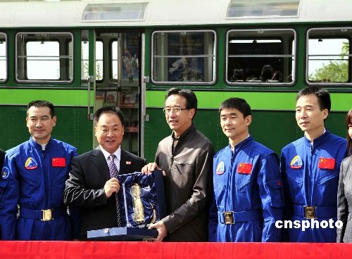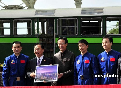 香港旅發(fā)局主席田北俊(中)向“神七”訪港代表團(tuán)贈(zèng)紀(jì)念品。