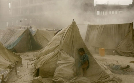 2008年10月7日,一名阿富汗難民兒童在沙塵暴中躲在一個(gè)難民營(yíng)地的帳篷后面。