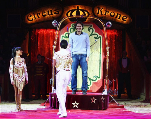 拜仁慕尼黑隊(duì)球員托尼與飛刀演員合作表演。