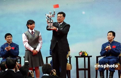 圖為澳門學(xué)子向“神舟七號(hào)”載人航天飛行代表團(tuán)贈(zèng)送航天機(jī)器人。中新社發(fā) 武仲林 攝
