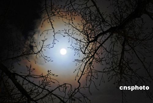 十二月十二日二十二時,北京夜空中的明月出現(xiàn)一圈橙色月暈,該現(xiàn)象在云層映襯在月亮周圍時出現(xiàn)。據悉,十三日零時三十七分,月球、地球和太陽排列成一條直線,此時月亮最圓,而在六時,月球距離地球全年最近,月亮的視直徑最大。中新社發(fā) 廖攀 攝