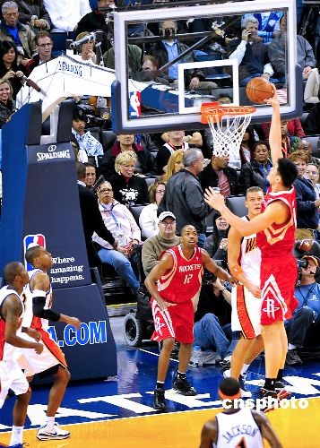 當(dāng)?shù)貢r(shí)間12月12日晚,休斯頓火箭隊(duì)與金州勇士隊(duì)在加州奧克蘭主場(chǎng)甲骨文體育館進(jìn)行一場(chǎng)比賽。姚明雖患感冒但仍拿下19分14個(gè)籃板,阿泰斯特因?yàn)橛夷_踝有傷休戰(zhàn),1號(hào)球星麥格雷迪復(fù)出首發(fā)并表現(xiàn)搶眼,最終火箭以119-108輕松戰(zhàn)勝對(duì)手取得兩連勝,時(shí)隔一周后再次大勝勇士。目前火箭總戰(zhàn)績(jī)達(dá)到15勝8負(fù),勇士7勝16負(fù)。圖為姚明上籃。中新社發(fā) 陳鋼 攝