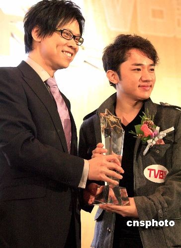 十二月十七日,《TBV周刊》2008最強(qiáng)人氣品牌大獎(jiǎng)?lì)C獎(jiǎng)禮在香港舉行。圖為無線電視總經(jīng)理陳志云(左)為2008最強(qiáng)人氣廣告新人王王祖藍(lán)頒獎(jiǎng)。中新社發(fā) 張勤 攝