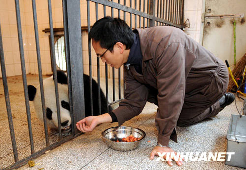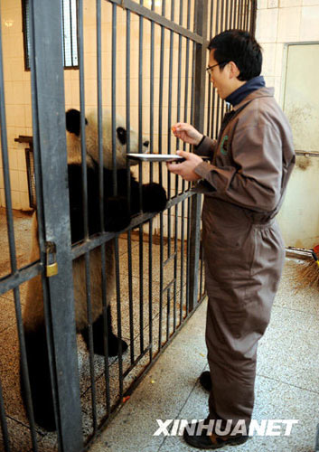 12月21日,臺北木柵動物園飼養(yǎng)員正在學(xué)習(xí)照顧“團團”、“圓圓”。 從2008年10月開始,臺北木柵動物園的3名飼養(yǎng)員分兩批來到中國保護大熊貓研究中心四川雅安碧峰峽基地,學(xué)習(xí)大熊貓飼養(yǎng)技術(shù)。目前,他們和贈臺大熊貓“團團”“圓圓”已經(jīng)建立感情,基本掌握了大熊貓飼養(yǎng)技術(shù)。