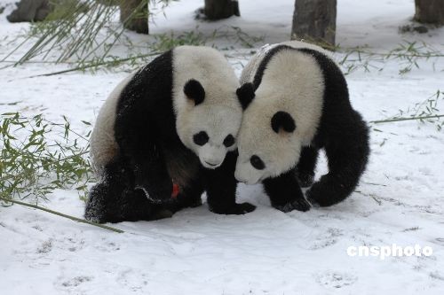 2008年1月,團(tuán)團(tuán)圓圓卿卿我我,面對鏡頭毫不避嫌。中新社發(fā) 衡毅 攝