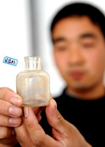 工作人員在展示一只在勘探現(xiàn)場(chǎng)發(fā)現(xiàn)的玻璃瓶。 李勇 攝