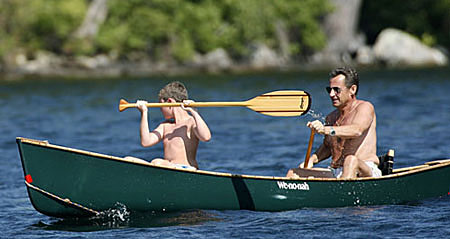 2007年8月4日,法國(guó)總統(tǒng)薩科齊與兒子在美國(guó)新罕布什爾州沃爾夫伯勒的溫尼珀索基湖上劃獨(dú)木舟,享受悠閑的假期。