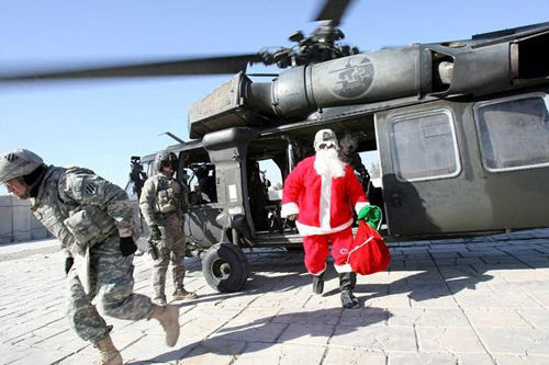 在伊拉克巴格達(dá),圣誕老人搭乘美軍直升機(jī)。