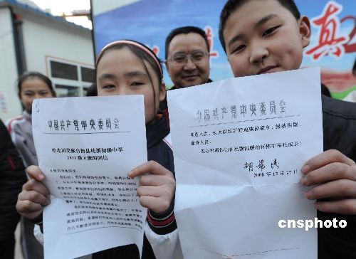 12月29日,四川地震極重災區(qū)的北川縣桂溪中學師生喜獲胡錦濤總書記的回信。吳天春校長和同學們兩天前受到胡總書記的看望,一位羌族女學生向臨告別時的總書記送上一封信和學校震后重建規(guī)劃圖的賀年片,兩天后就收到從成都轉(zhuǎn)來總書記的回信。中新社發(fā) 賈國榮 攝