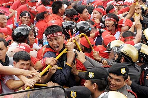 12月30日,泰國警察在為新總理阿披實開路進入外交部時和前總理他信的支持者發(fā)生沖突。由于他信的支持者“紅衫軍”包圍國會,阿披實被迫易地至外交部發(fā)表施政演講。