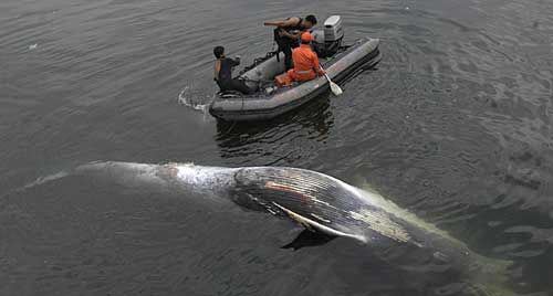 12月30日,菲律賓海岸警衛(wèi)隊(duì)在馬尼拉灣附近打撈起一具罕見(jiàn)的小須鯨尸體。這只重約2噸長(zhǎng)約10米的小須鯨的死因可能是與大型渡船相撞或者因?yàn)檠罅鞯淖兓月,這是馬尼拉灣附近首次浮現(xiàn)鯨魚(yú)尸體。