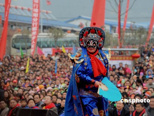 12月31日,川劇著名變臉演員在四川地震極重災(zāi)區(qū)的擂鼓鎮(zhèn)板房區(qū)前,展示噴火技藝慰問北川縣上萬民眾干部,以迎元旦文藝表演告別難忘的2008年。中新社發(fā) 賈國榮 攝