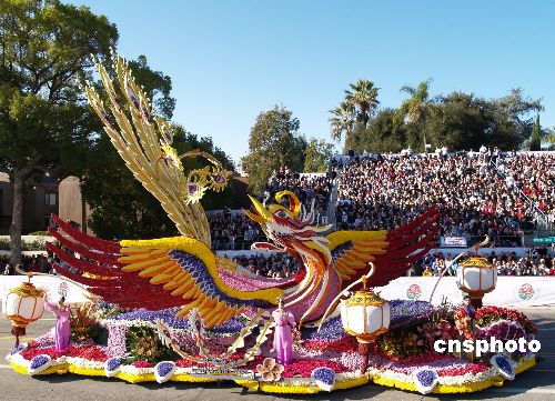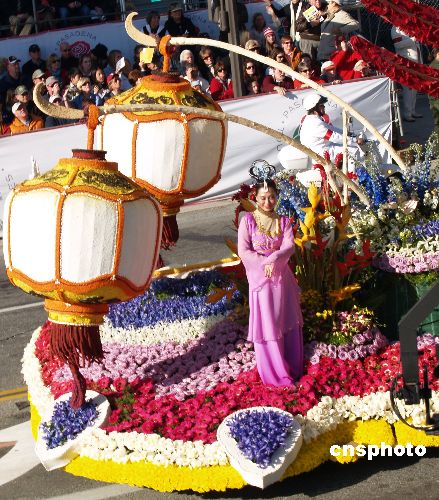 臺(tái)灣中華航空公司的玫瑰花車(chē)“火鳳凰”在美國(guó)洛杉磯第120屆玫瑰花車(chē)游行勇奪大獎(jiǎng)。該主題花車(chē)名為“臺(tái)灣燈會(huì)”,花車(chē)以中國(guó)燈籠和“仙女下凡”為元素,奪人眼球。中新社發(fā) 盧威 攝